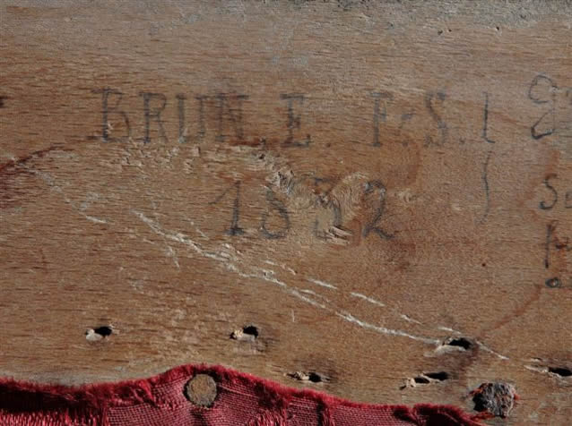 Portant une étiquette sous le fauteuil : " Brun E F S 183, grand-père de Ernest Théodore Brun décédé à Orgerus le 29 janvier 1943, selon lui le maître E. Brun (1805-1868) fut le sculpteur de l'Autel de la Patrie à l'Arc de Triomphe et ancien pensionnaire de Rome de 1835 à 1838. Quod attestator ego, ciré d'Orgerus et tampon du diocèse de Versailles ".