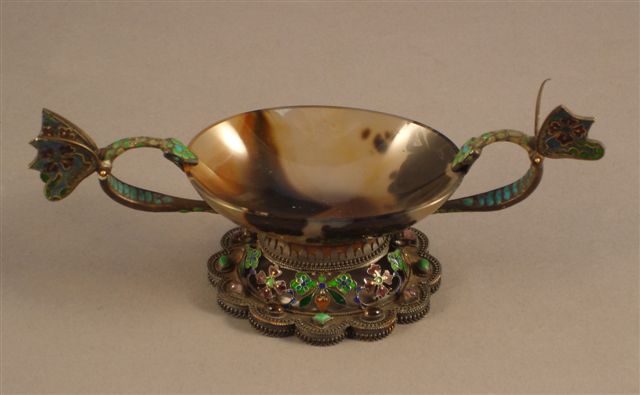 COUPE en agate montée de forme oblongue. La monture est en métal ajouré et émaillé. L'agate taillée repose sur un piètement ajouré et émaillé de fleurettes, et il est orné à la base de cabochons de pierres colorées. Le revers du piètement est gravé d'un écusson dans lequel figure une épée entourée de deux iris et surmontée des initiales "AP". Les prises sont constituées de deux dragons ailés, émaillés de vert et de bleu évoquant leurs écailles. Les ailes émaillées sont partiellement constituées d'émaux ajourés. (manque une aile).