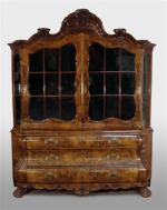 BUFFET-VITRINE de forme chantournée en noyer et placage de loupe de noyer. Sommé d'une corniche mouvementée agrémentée de trois noix rocaille d'agrafes affrontées formant sellettes. Les pans coupés, il ouvre dans sa partie supérieure à deux vantaux vitrés de forme chantournée. La partie inférieure, galbée, ouvre à trois tiroirs sur trois rangs. Ceinture chantournée, moulurée, centrée d'un pot fleuri, sculptée de guirlandes et de fleurs stylisées. Pieds antérieurs de types "claw and ball". Ornements de bronze tels que : entrées de serrure et prises. (accidents).