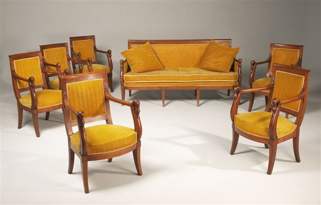 Dossiers carrés-légèrement incurvés pour les fauteuils, et plat pour le canapé - se terminant par un enroulement. Supports d'accotoirs en forme de col de cygne prolongé. Ornementation de feuille d'eau pour le raccordement au montant du dossier. Ceinture légèrement bombée. Piétement sabre.