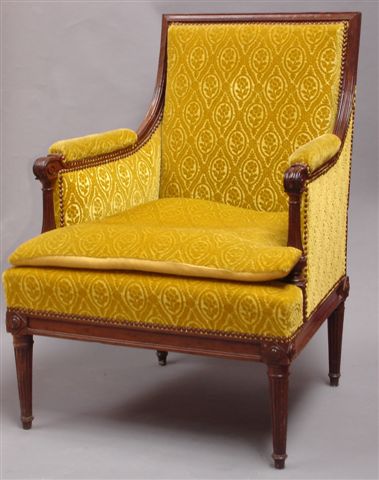 BERGÈRE à dossier droit carré, en acajou mouluré. Fût balustre, reposant sur des pieds cannelés.