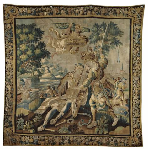 Le modèle de cette tapisserie est le frontispice gravé d'après Claude Vignon (1593 - 1670) de l'ouvrage de Jean Chapelain paru en 1656 : La Pucelle ou la France délivrée dédié au duc de Longueville, descendant de Dunois, compagnon de Jeanne d'Arc.