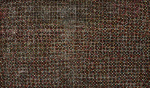 Tapis brodé sur toute sa surface d'un motif répétitif de petits cercles enfermant des soleils (ou des étoiles) stylisés polychromes sur fond noir.