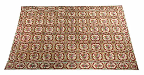 Ce grand et joli tapis est composé de cinquante quatre carrés brodés sur canevas et cousus entre eux. Chaque carré renferme un bouquet de roses très naturalistes sur fond blanc. La bordure est à fond turquoise avec des bouquets semblables présentés dans des cartouches. S'il s'agit d'un travail d'ouvroir, à la différence de l'autre tapis, les différents carrés ont vieilli de la même façon.