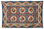 Le tapis est constitué de six grands carrés de canevas brodés, avec deux bandes de part et d'autre. Sur un fond bleu vif, se détache dans chaque carré un bouquet de fleurs (anémones et violettes) posé sur un fond blanc, cerné de feuillage stylisé rouille. L'ensemble est encadré d'une large bordure à fond bleu orné d'un feston blanc et rouille à décor de fleurs.