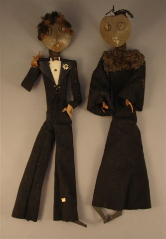 Deux figures en métal, feutre, tissu, peau de chevreau, bois et matière plastique.