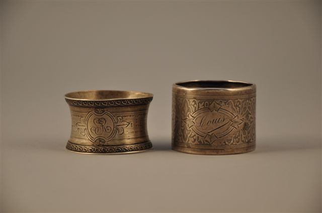 Deux RONDS de SERVIETTE. Le premier de forme concave à motifs de grecques sur fond guilloché et frises de feuilles stylisées en bordure, monogrammé "SR" dans un cartouche. Le second de forme droite à frise gravée de motifs stylisés, gravé "Louis" dans un cartouche. Poinçon Minerve.