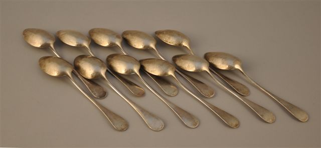 Suite de ONZE CUILLÈRES à CAFÉ en argent, modèle baguette ou Vieux Paris. Orfèvre E.P.