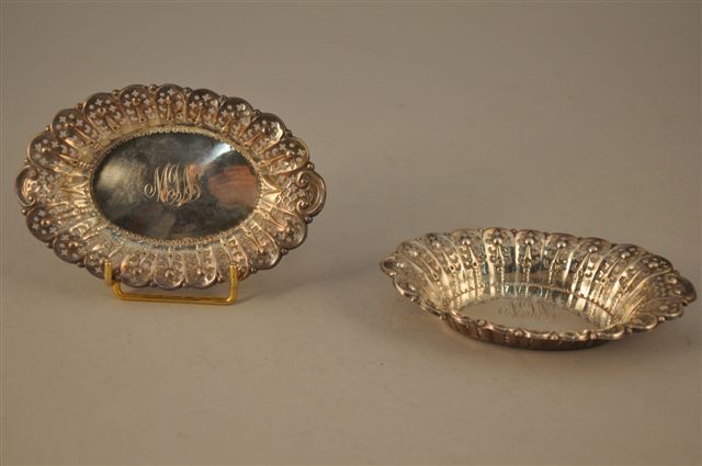 Paire de petites COUPES ovales en argent, de forme évasée à côtes, ajourées de motifs géométriques, monogrammées M.I.N. au centre. Angleterre.