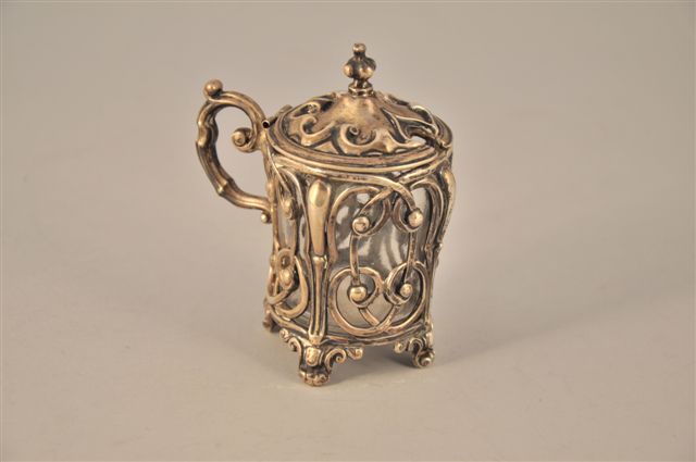 MOUTARDIER en argent reposant sur quatre pieds en volute, le corps en repoussé à quatre montants à décor d'entrelacs, couvercle à motifs de cuirs, intérieur en verre blanc moulé. Poinçon Minerve.