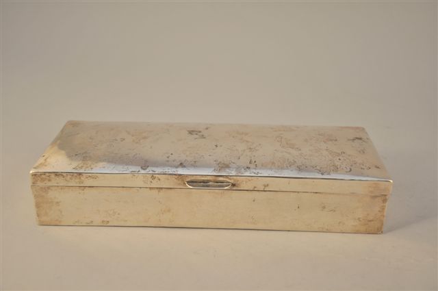 BOÎTE rectangulaire en argent, âme en bois, le couvercle légèrement bombé uni, intérieur à trois compartiments. Marquée SANBORNS.