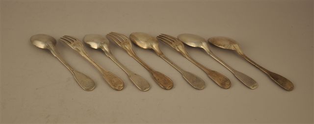 CINQ CUILLÈRES et TROIS FOURCHETTES en argent, modèle à filets, monogrammés, dont Premier Coq (1798-1809), certains poinçons effacés. XIXème.