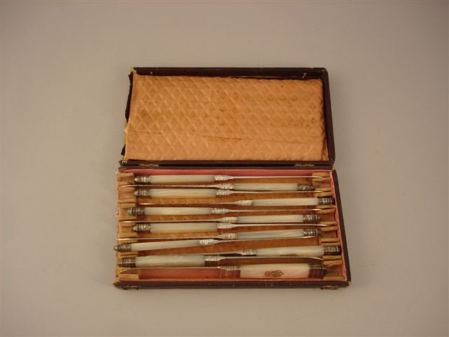 DOUZE COUTEAUX À FRUITS. La lame en argent et le manche en nacre monogrammé "SG". Dans un écrin. Poinçon Minerve. Style Louis XVI. Fin du XIXème siècle.