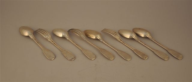 ENSEMBLE de TROIS COUVERTS en argent uni. Modèle filet. Arras, fin du XVIIIème siècle. Poinçon du maître-orfèvre Philippe JOUQUE, reçu en 1752. Joint deux cuillères en argent du même modèle (Arras, fin du XVIIIème siècle).