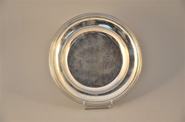 PLAT rond en argent, bordure à godrons. Gravé d'armoiries sur...