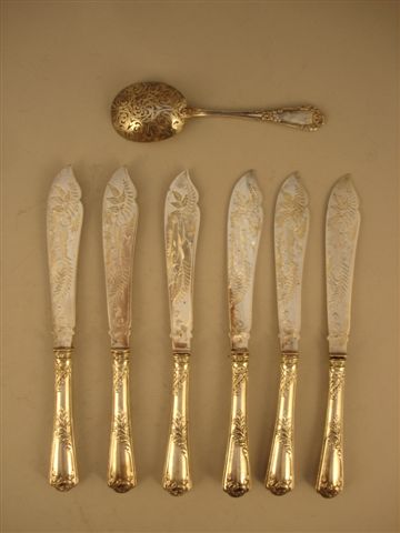 SIX COUTEAUX À POISSON en argent. La lame en argent à décor de poissons et rinceaux. Le manche en argent fourré orné de feuillage. Poinçon Minerve.