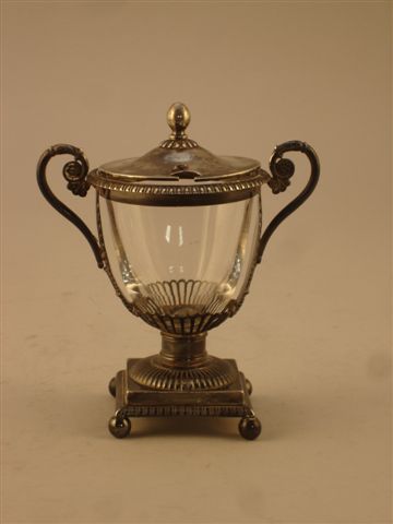 MOUTARDIER argent. En forme de coupe aux anses hautes, il est constitué d'une monture en argent contenant un récipient en verre blanc. La monture ajourée figure une frise de godrons et deux larges palmettes. Les anses, en fines volutes, se terminent en enroulements de cornes d'abondance. Couvercle en doucine, le frételet constitué d'un bouton. Base carrée reposant sur quatre pieds boule. Poinçon Vieillard (Paris, 1819-1838).