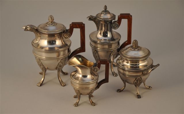 SERVICE à THÉ et CAFÉ de quatre pièces en argent comprenant cafetière, théière, sucrier couvert, un pot à lait. Modèle au riche répertoire iconographique de l'époque Empire : acanthes, feuilles d'eau, graines, frise de godrons, pieds griffus, becs verseurs en tête d'aigle. Anses à décrochement en bois teinté. Poinçon Minerve. Style Empire. Début du XXème siècle.