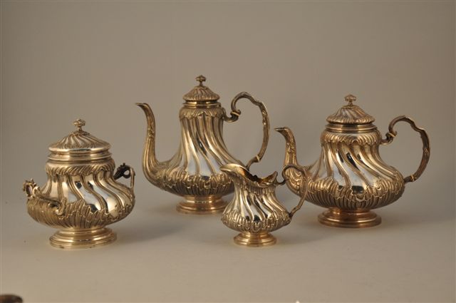 SERVICE À THÉ ET CAFÉ comprenant quatre pièces : une cafetière, une théière, un pot à lait, un sucrier couvert. Repose sur pied circulaire à profil mouluré. Le col en doucine, la panse ciselée de côtes torses et de vagues stylisées. Les attaches mouvementées et décorées de panaches feuillagés. Le frétel figurant un bouton mouvementé. Becs verseurs ornés de larges cannelures et rinceaux feuillagés. Poinçon Minerve.