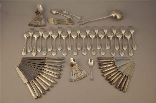 MÉNAGÈRE en argent de 85 pièces monogrammée MS. Modèle coquille. Elle comprend 12 couverts de table, 12 couverts à entremets, 12 couteaux de table le manche en argent fourré, 12 couteaux à entremets le manche en argent fourré, 12 cuillères à dessert, une louche. Poinçon Minerve. Poinçon d'orfèvre différent pour les couverts et couteaux à entremet, avec légère différence : coquille supplémentaire à l'attache. Début du XXème siècle.