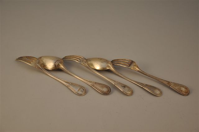 Suite de DEUX COUVERTS et une fourchette en argent, modèle de forme baguette à motifs d'entrelacs. Orfèvre : VEYRAT. Poinçon Minerve.