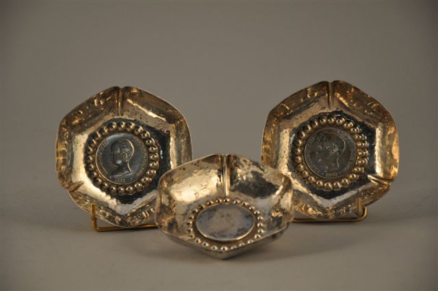 Trois COUPELLES circulaires en argent martelé de forme trilobée. Le bassin à rang de perles en repoussé, constitué dans le fond, pour les deux premières, de deux pièces en argent de 5 Pesetas figurant le roi Alphonso XIII d'Espagne, datées 1891 et 1898 . La troisième est monogrammée RM. Marquées J. ROCA.