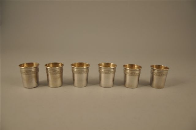 6 GOBELETS À LIQUEUR en argent, décor de frise. Poinçon...