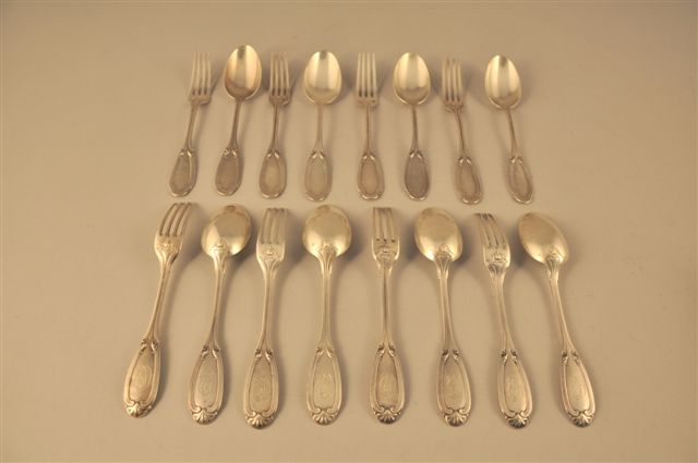 8 COUVERTS DE TABLE en argent modèle à filet, monogrammé " CD ". Poinçon Minerve.