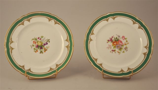 PARIS. LAHOCHE. Paire d' ASSIETTES montées en porcelaine blanche polychrome à décor peint floral, bandeau vert en bordure. Marque "Palais Royal". XIXème. Diam. 22 cm.
