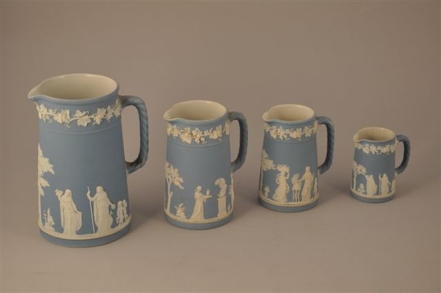 WEDGWOOD. Série de quatre PICHETS en bleu et blanc. Haut. 21, 16,5, 14 et 10 cm.