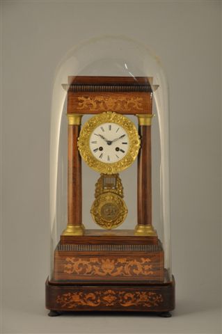 PENDULE PORTIQUE à quatre colonnes en palissandre et incrustation de bois clair. Cadran et balancier en bronze doré. Elle repose sur un socle et est présentée sous un globe.