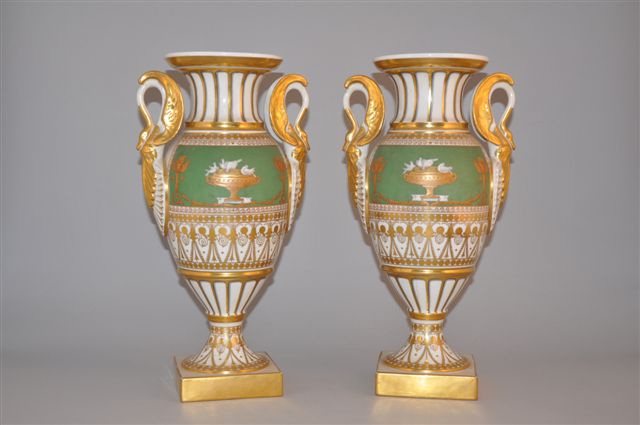 Paire de VASES balustres en porcelaine dite de Paris polychrome, sur piédouche, anses aux cols de cygnes et palmettes, décor or godronné avec postes, points et guirlandes végétales stylisées, dans des réserves tableaux en grisaille de colombes sur fond amande. Style Restauration. XXème. Haut. 46 cm. (accident).