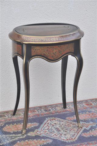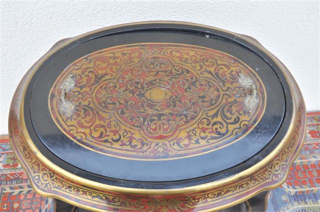 JARDINIÈRE de salon de forme ovale reposant sur quatre pieds cambrés. Le dessus à doucine présente un plateau mobile. Marqueterie genre Boulle, écailles de tortue rouge et filets de cuivre. Bac en tôle.