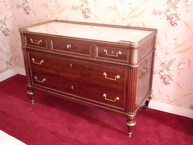 COMMODE en acajou ouvrant à trois rangs de tiroirs dont trois dans la rangée supérieure, et deux inférieurs sans traverses. Il repose sur quatre pieds toupies. Montants à cannelures, piètement toupie. Dessus marbre blanc veiné. Galerie lingotière ajourée sur le dessus, grattoir, prises de mains et filets de bronze. Entrées de serrures à trèfles.