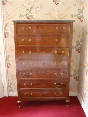 SEMAINIER en acajou reposant sur quatre pieds toupies. Dessus marbre turquin. Prises de mains, entrées de serrures et filets de cuivre.