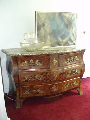 COMMODE TOMBEAU en bois de placage et marqueterie de fleurs dans des entrelacs. Elle ouvre à trois rangs de tiroirs, dont deux dans la partie supérieure. Bronzes dorés Rocaille. Dessus marbre brèche d'Alep. Style début XVIIIème. Haut. 84, Larg. 138, Prof. 67 cm.