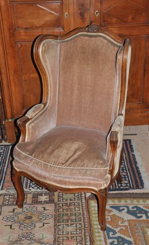 BERGÈRE À OREILLES en noyer mouluré et sculpté. Dossier droit sculpté d'un bouquet de fleurs. Accotoirs sinueux en coup de fouet. La ceinture mouvementée à décor de fleurettes. Elle repose sur quatre pieds cambrés.