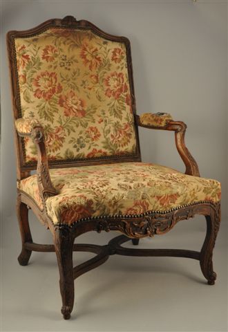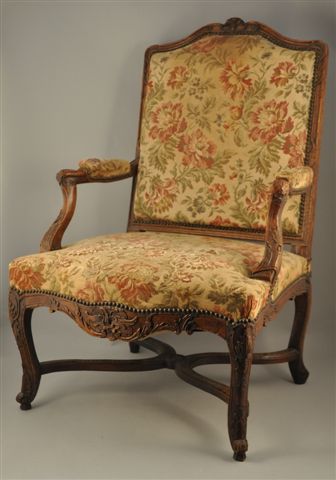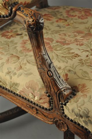 Paire de larges FAUTEUILS à la Reine en noyer mouluré et sculpté. Entrejambe en "X" sculptée de fleurettes, pieds galbés sculptés de motifs végétaux stylisés, traverse antérieure sculptée de feuilles d'acanthes à cartouche médian quadrilobé. Traverses latérales sculptées d'une coquille et de volutes accolées. Accotoirs en retrait finement sculptés de rosaces et de feuilles d'acanthes. Montants du dossier sculptés de motifs végétaux, haut du dossier à motif en "goutte"