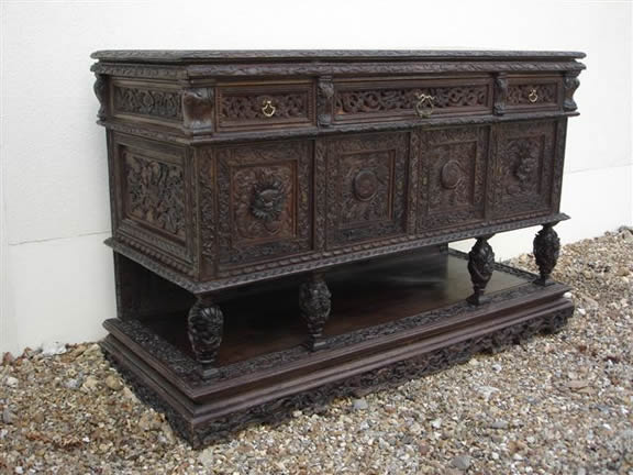 BUFFET BAS en chêne mouluré et sculpté. Il ouvre à trois tiroirs en ceinture et quatre vantaux en partie centrale dévoilant une étagère. Il repose sur quatre pieds ovoïdes en bois noirci réunis par une plinthe de forme rectangulaire. Riche décor d'inspiration chinoise : têtes de dragons, fleurs de lotus, frises de pampres et rameaux fleuris. Style Renaissance. XIXème siècle. Haut. 101, Larg. 152, Prof. 161 cm.