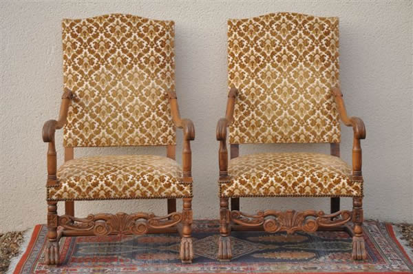 PAIRE de FAUTEUILS à haut dossier en bois naturel mouluré et sculpté. Les accotoirs galbés et à enroulements de feuilles d'acanthe. Consoles d'accotoirs en balustre. Pieds antérieurs à griffes de lion. Pieds postérieurs sabre. Entretoise en H. Traverse inférieure ajourée ornée de coquille et rinceaux. Style Louis XIV. XIXème siècle. Haut. 110, Larg. 62, Prof. 54,5 cm.