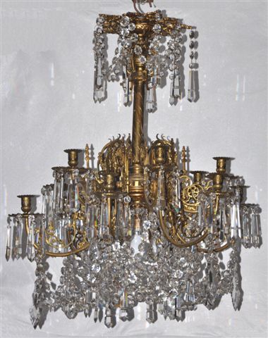 LUSTRE en bronze à décor de faunes. Double couronne de 6 lumières soit 12 binets pour bougie. Cristal : lancettes, plaques, chaînes et étoiles.