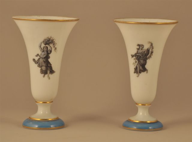 Paire de VASES CORNET en verre opalin blanc orné dans une réserve ovale de divinités mythologiques, à la manière de grisaille. Haut. 20 cm.