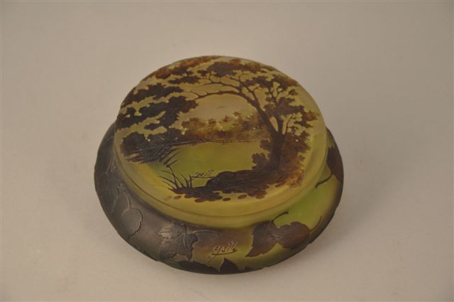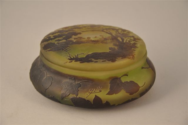 Émile GALLÉ (1846-1904). BONBONNIÈRE en verre multicouche, gravée à l'acide, à décor lacustre vert et brun. Signature en relief sur le couvercle et sur la panse. Haut. 6, Diam. 12 cm.