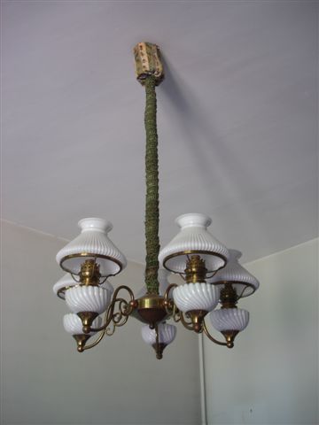 LUSTRE en laiton doré et verre opalin à cinq bras de lumière. Décor de godrons spiralés et enroulements de volutes. Style Hollandais, fin XIXème. Haut. 29, Diam. 60 cm.