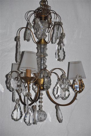 LUSTRE en métal doré à trois bras de lumières en arc, à pampilles en verre, chantournées et polylobées.