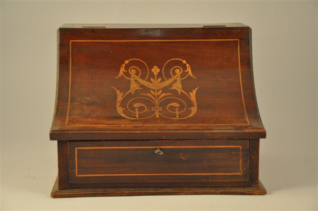 CLASSEUR à courrier en acajou et placage d'acajou ouvrant à un tiroir fermant à clé et un abattant à profil concave marqueté de rinceaux drapé, en bois clair, il découvre trois cases. Base à baguette moulurée. Probablement Angleterre, fin XIXème - début XXème. Haut. 24, Larg. 32, Prof. 26,5 cm.