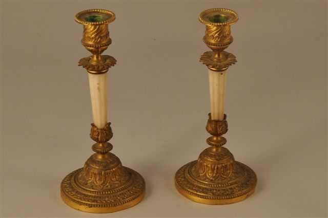 Paire de FLAMBEAUX en bronze et albâtre, la base circulaire à frise de feuille et de rang de perles. Fin XIXème. Haut. 22,5 cm (petits chocs).