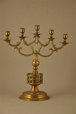 CANDÉLABRE en bronze à cinq lumières en ligne, la base circulaire, le fût à profil tourné formant galerie, bras en volutes feuillagées et binets ovoïdes. XIXème. Haut. 46 cm.