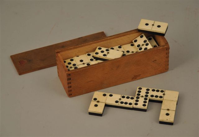 JEU de DOMINOS en bois noirci et os, 28 pièces. Dans un coffret en bois naturel, dessus coulissant. Joint : Modèle réduit SOLIDO.