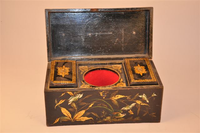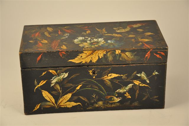 BOÎTE À THÉ en bois peint de scènes d'oiseaux dans les branchages fleuris, intérieur noir et or à décor floral. Travail anglais, fin XIXème.